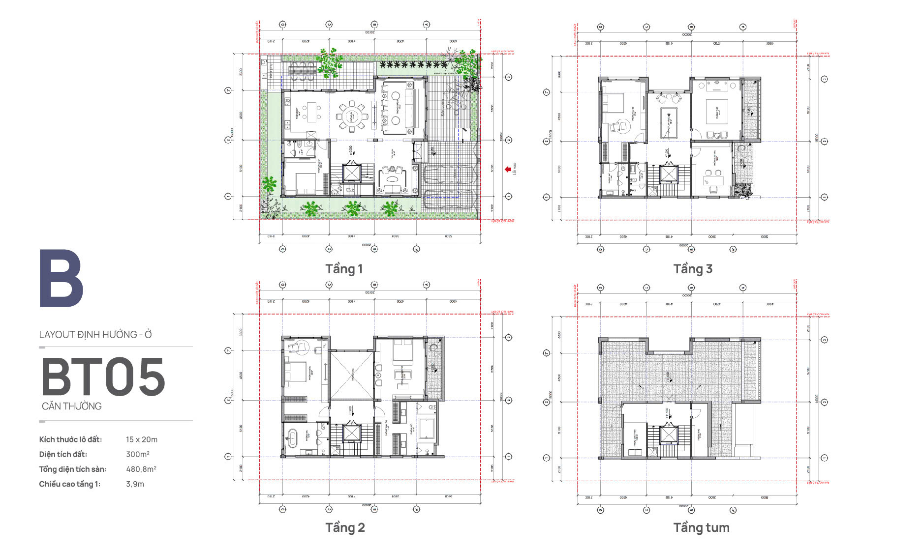 – 16 căn Biệt thự: Diện tích đất: 15x20m (từ 287,5m2 – 300m2); Diện tích xây dựng: 472,8m2 – 480m2
