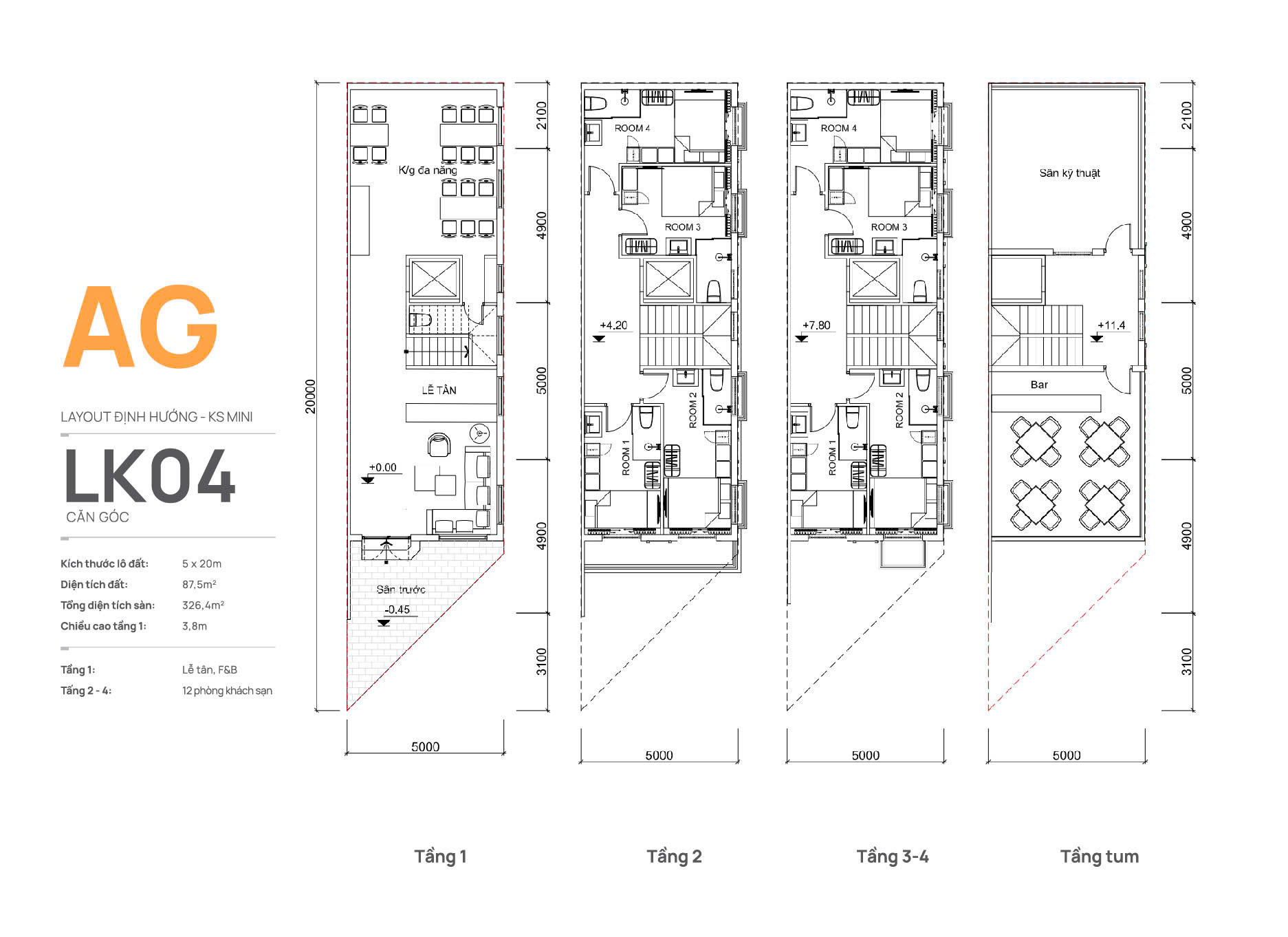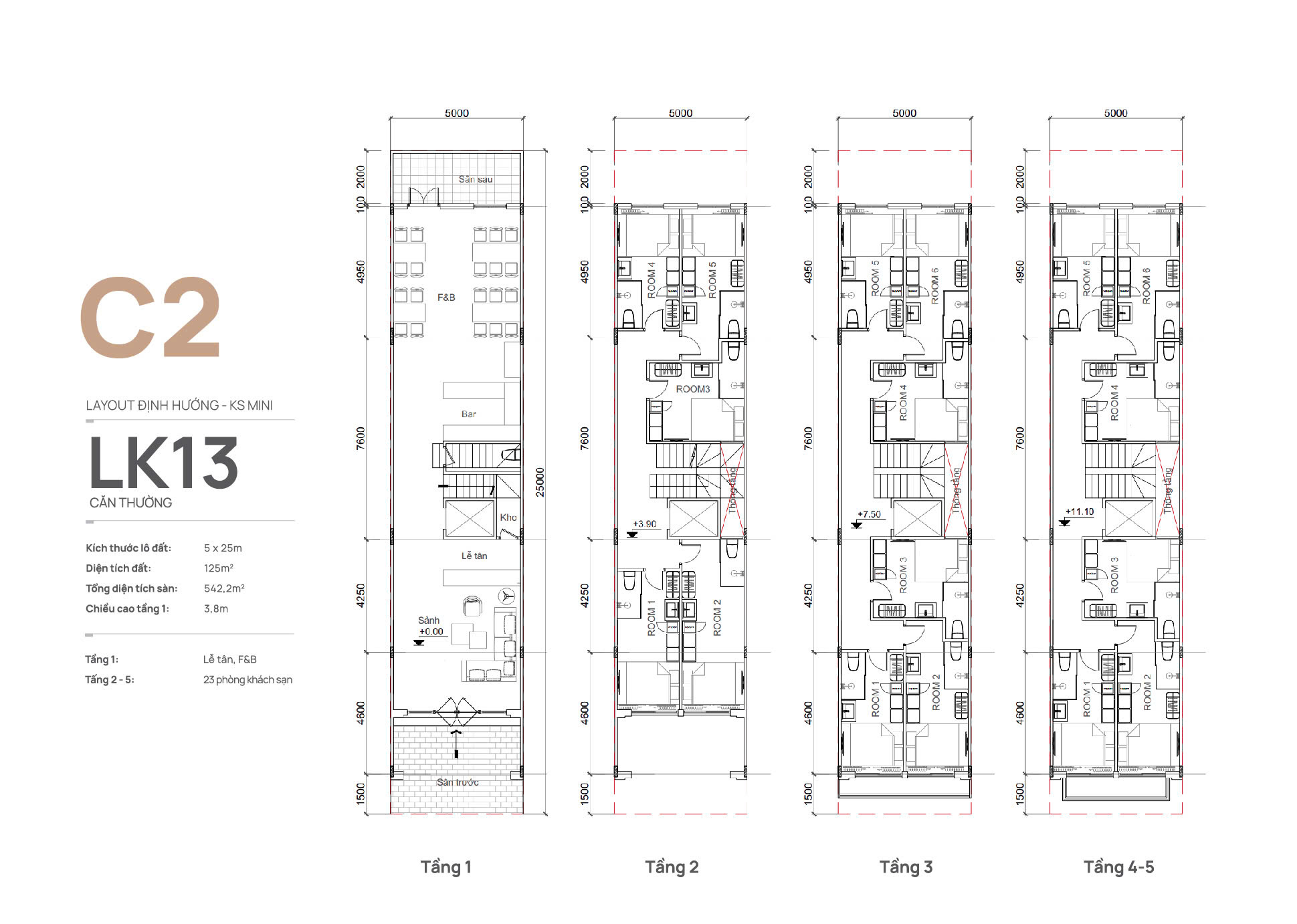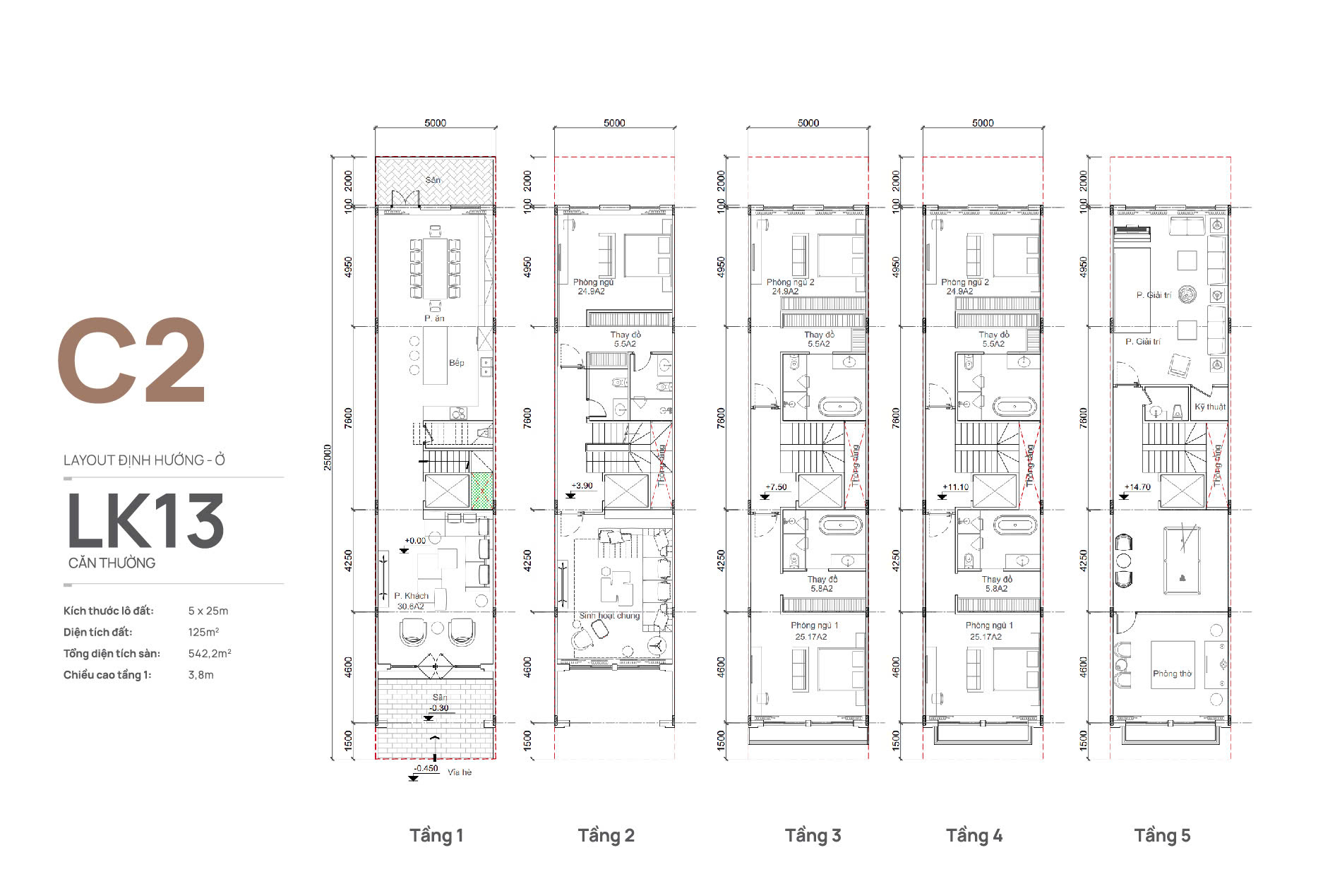 – 118 căn Liền kề: Diện tích đất: 5x20m và 5x25m (từ 87,5m2 – 198,4m2); Diện tích xây dựng: 307,8m2 – 857,4m2