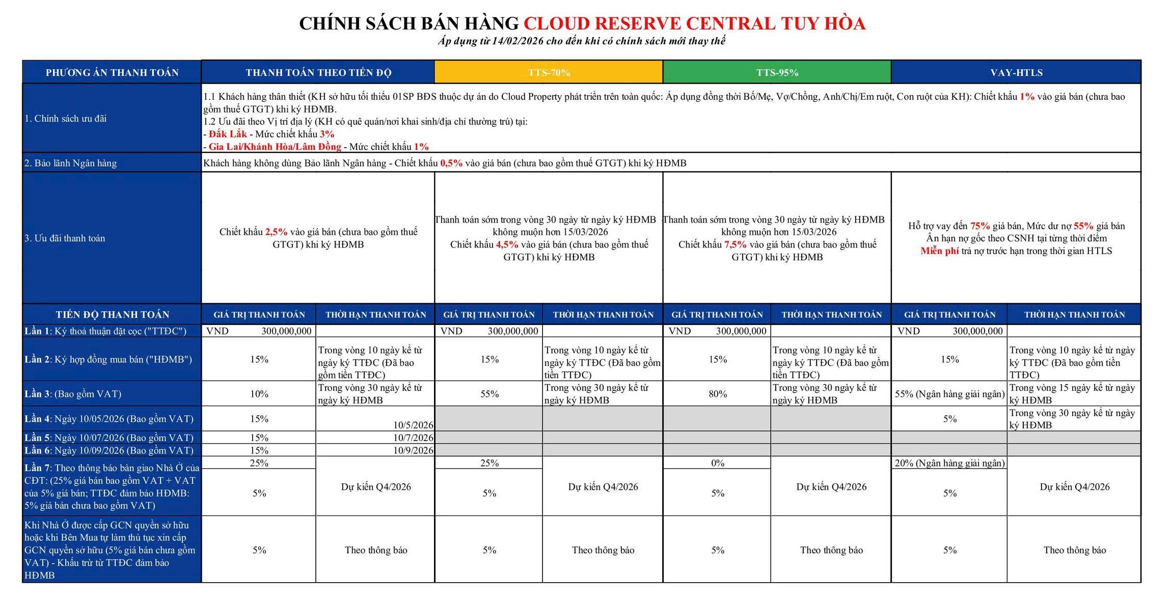 Từ 14/02/2026, Cloud Reserve Central Tuy Hoa ban hành chính sách ưu đãi đặc biệt dành cho khách hàng, cụ thể như sau: