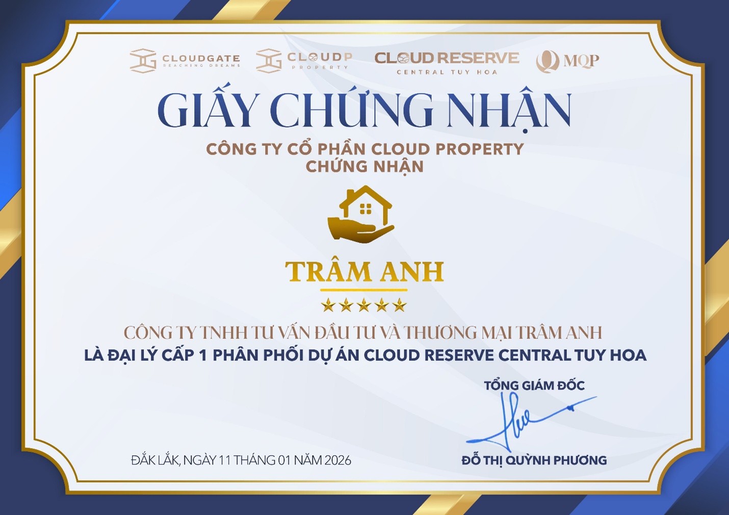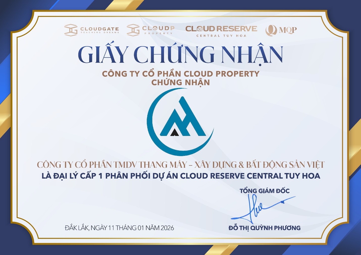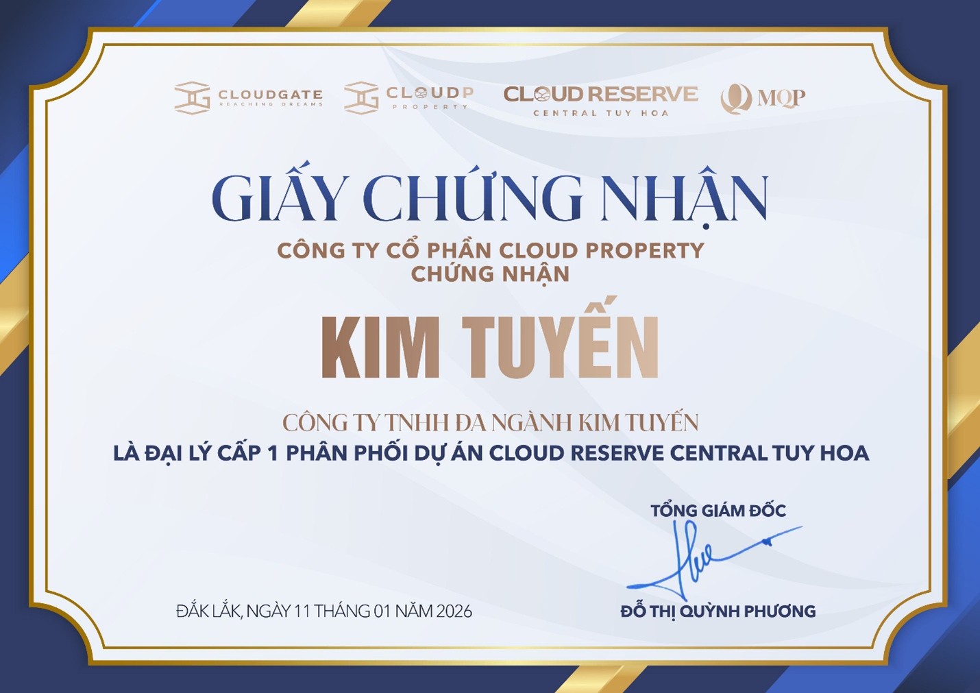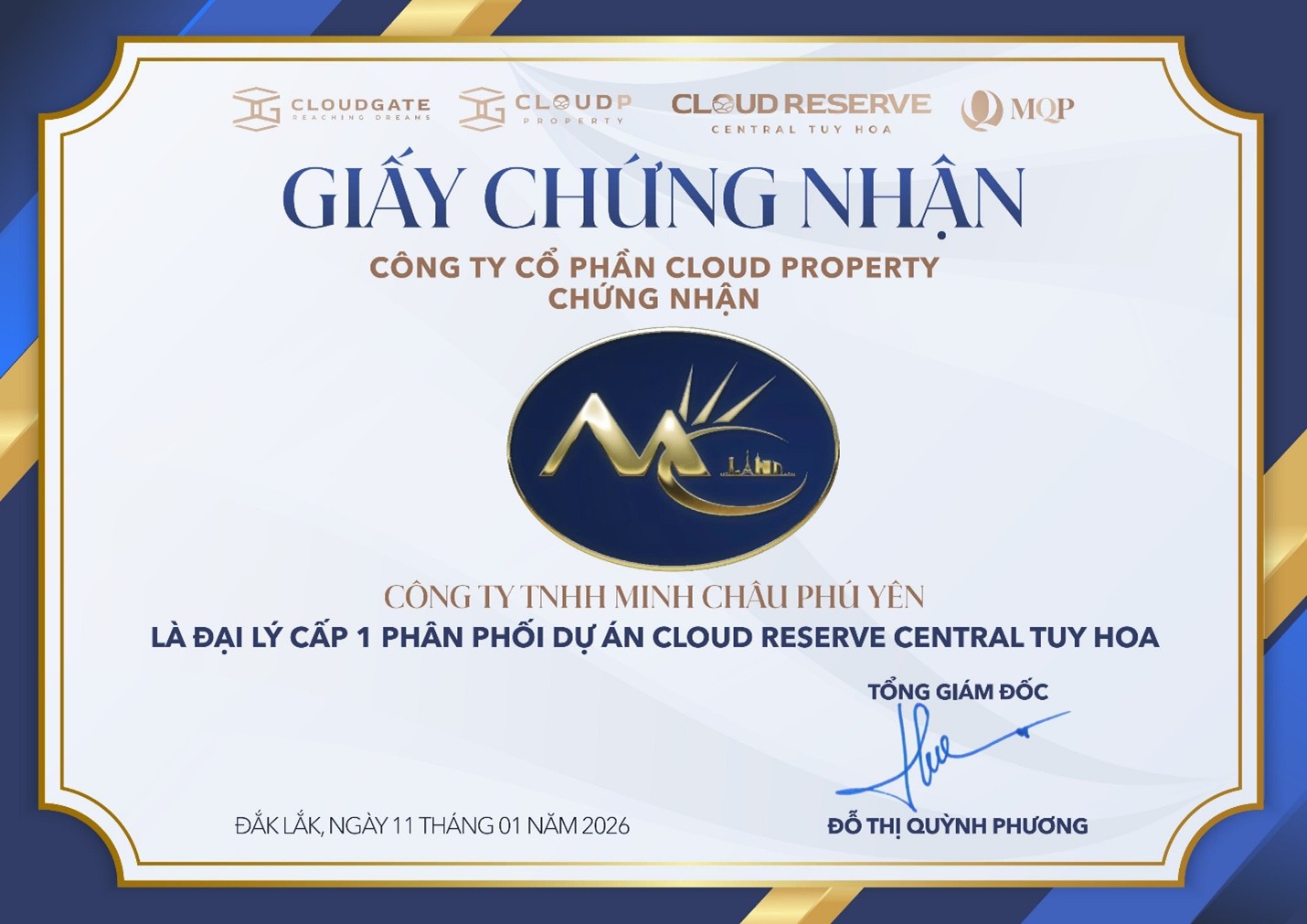Sau đây là Giấy chứng nhận đại lý phân phối chính thức Dự án Cloud Reserve Central Tuy Hoa do Chủ đầu tư Cloud Gate cấp: