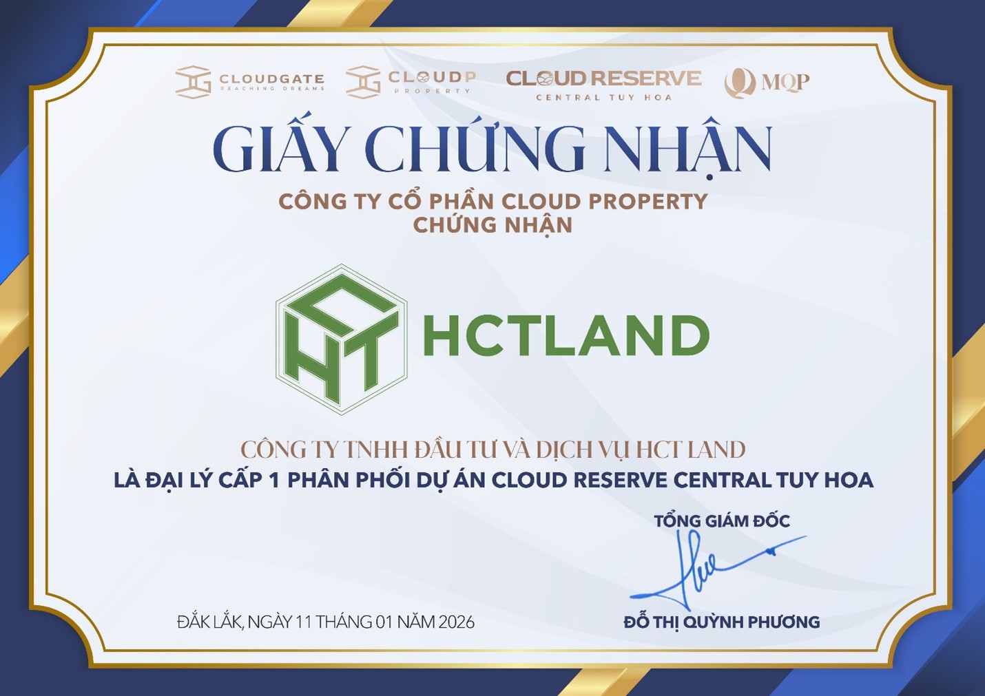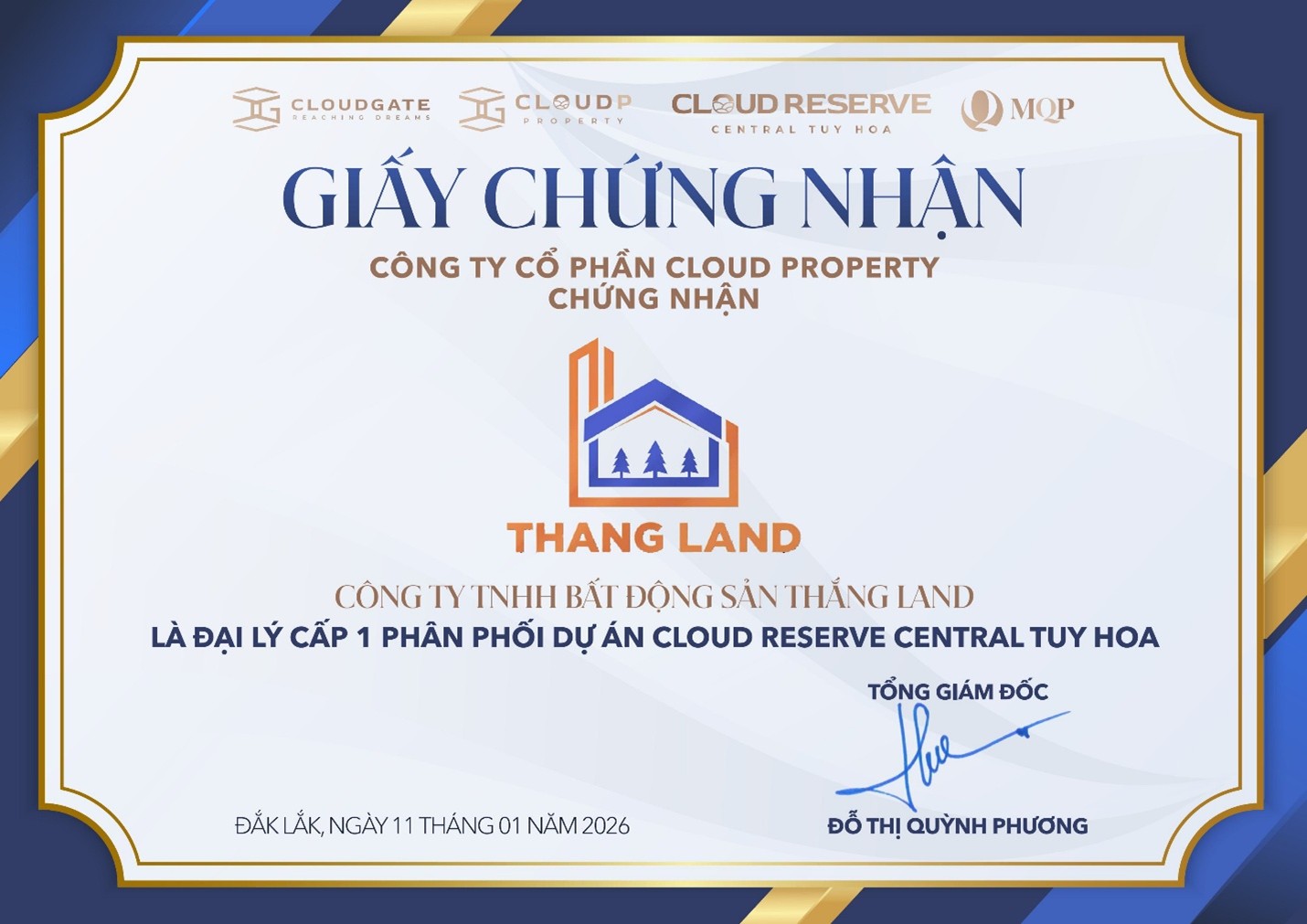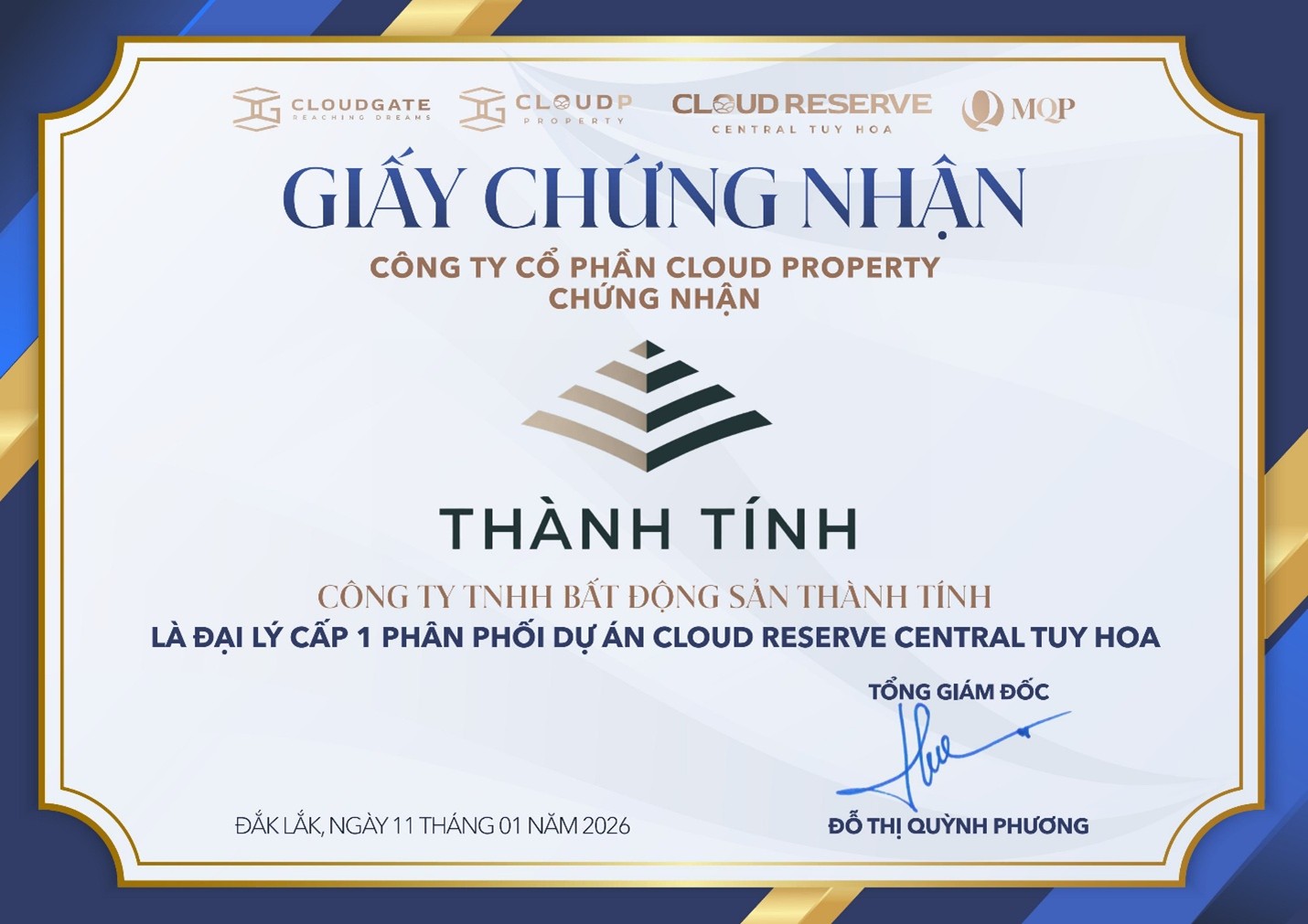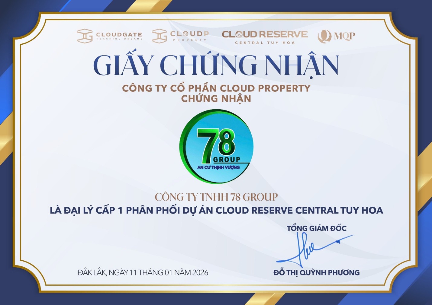Sau đây là Giấy chứng nhận đại lý phân phối chính thức Dự án Cloud Reserve Central Tuy Hoa do Chủ đầu tư Cloud Gate cấp: